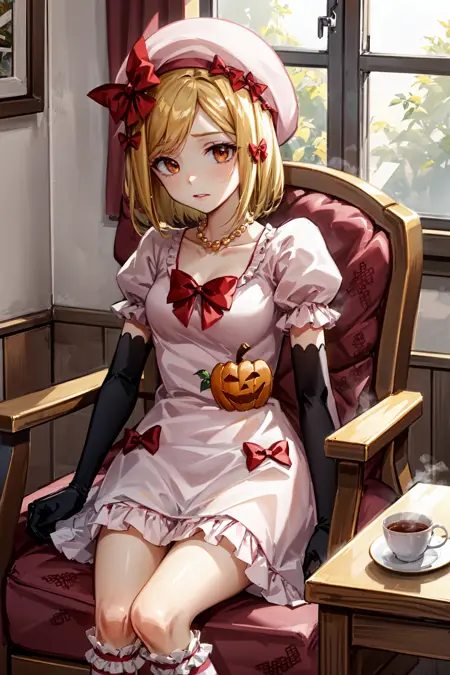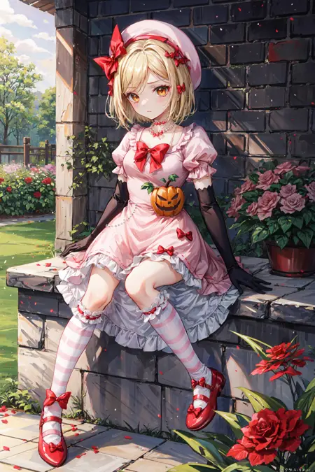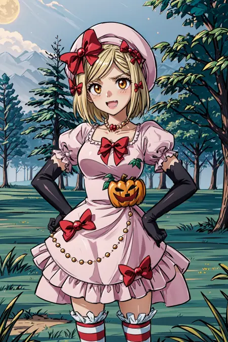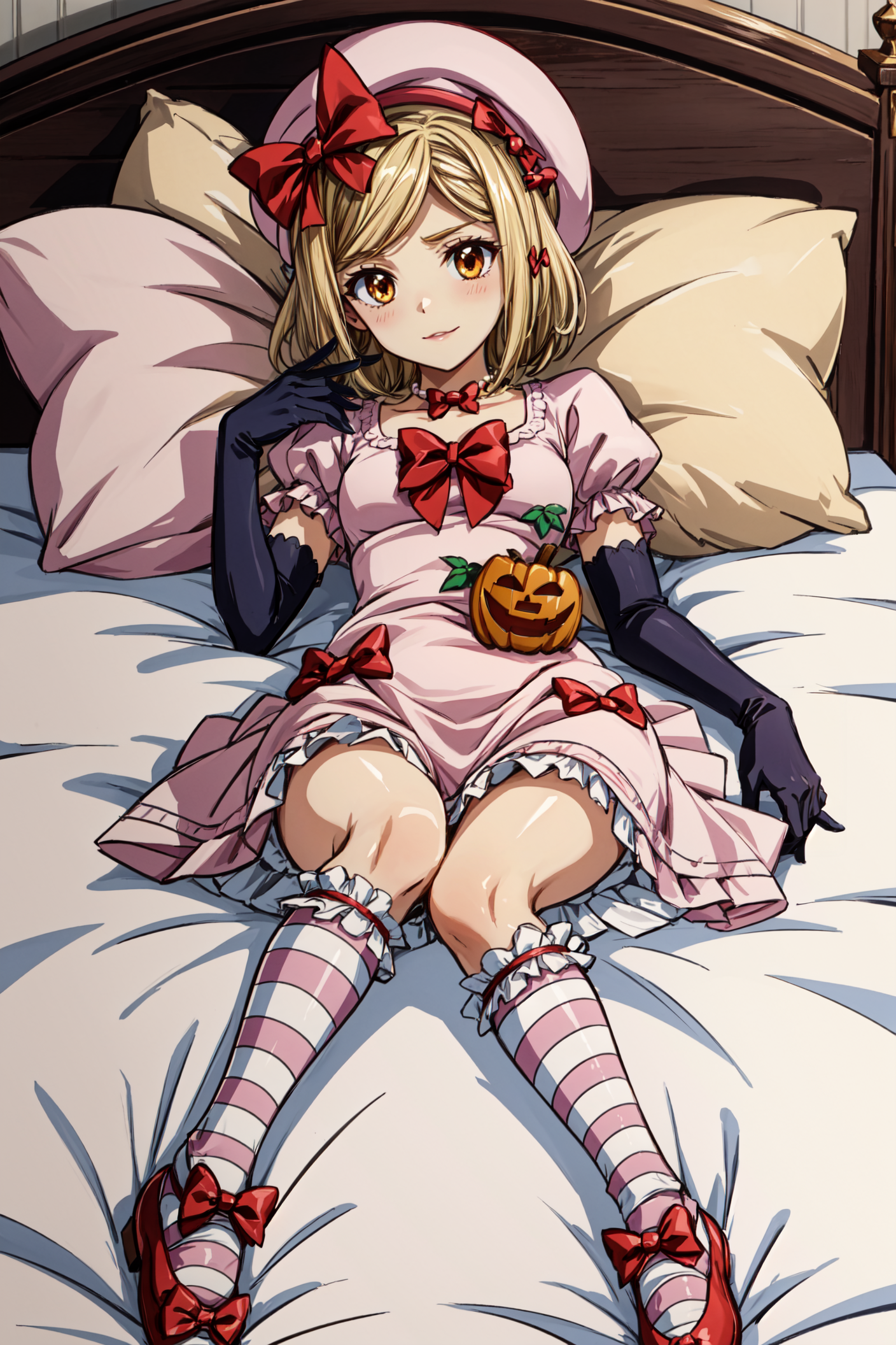 Witch outfit: dress, shoes bow, red shoes, striped stockings, red bow, pink hat, necklace, gloves, pearl, pumpkin brooch