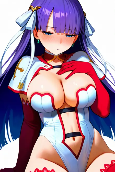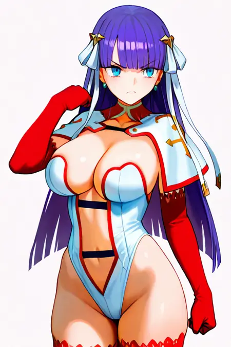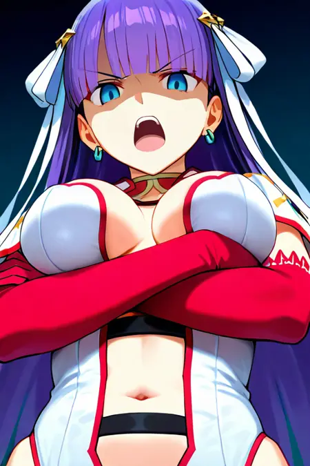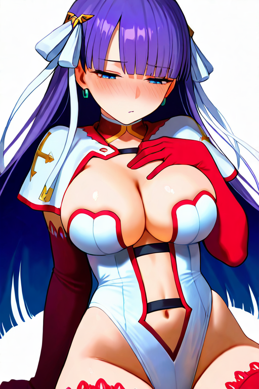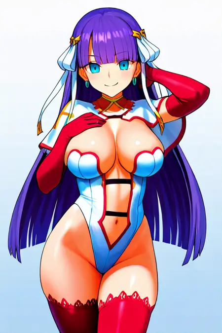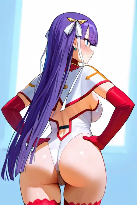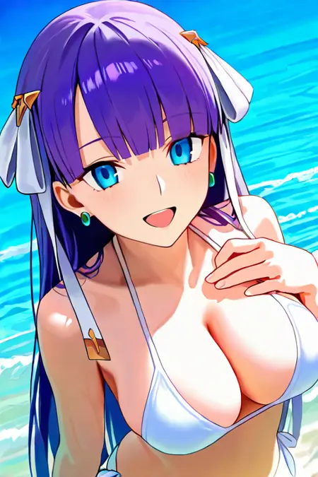 1girl, solo, rider_martha_(fate), 長髪, 紫髪, ジュエリー, ヘアリボン, まっすぐな前髪, 青い目, ピアス,
