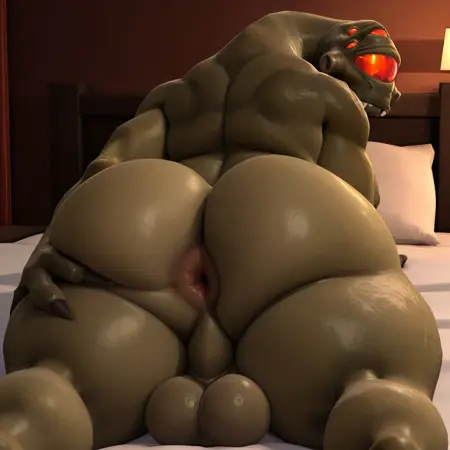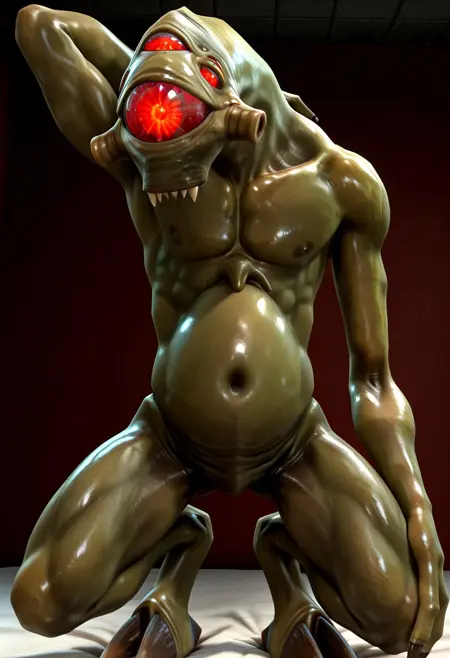 タグ:ヴォルティガント、エイリアン、赤い目、3つの小さな赤い目、1つの大きな目、顔の突起、出っ歯、尖った歯、オリーブ色の肌、4つの乳首、胸筋、お腹、へそ、胸に第3の腕、長い腕、長い足、蹄のある足、それぞれの手に2つの爪、趾行性、猫背