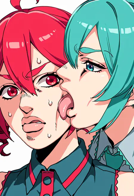 トリガーワード: taste_of_a_liar_meme、汗、舌、舌を出す、なめる、他人の顔をなめる、