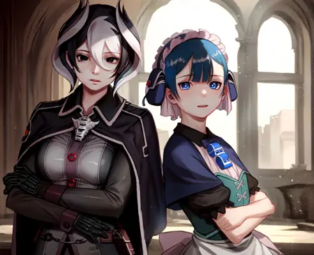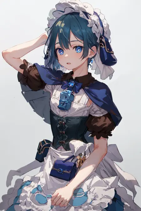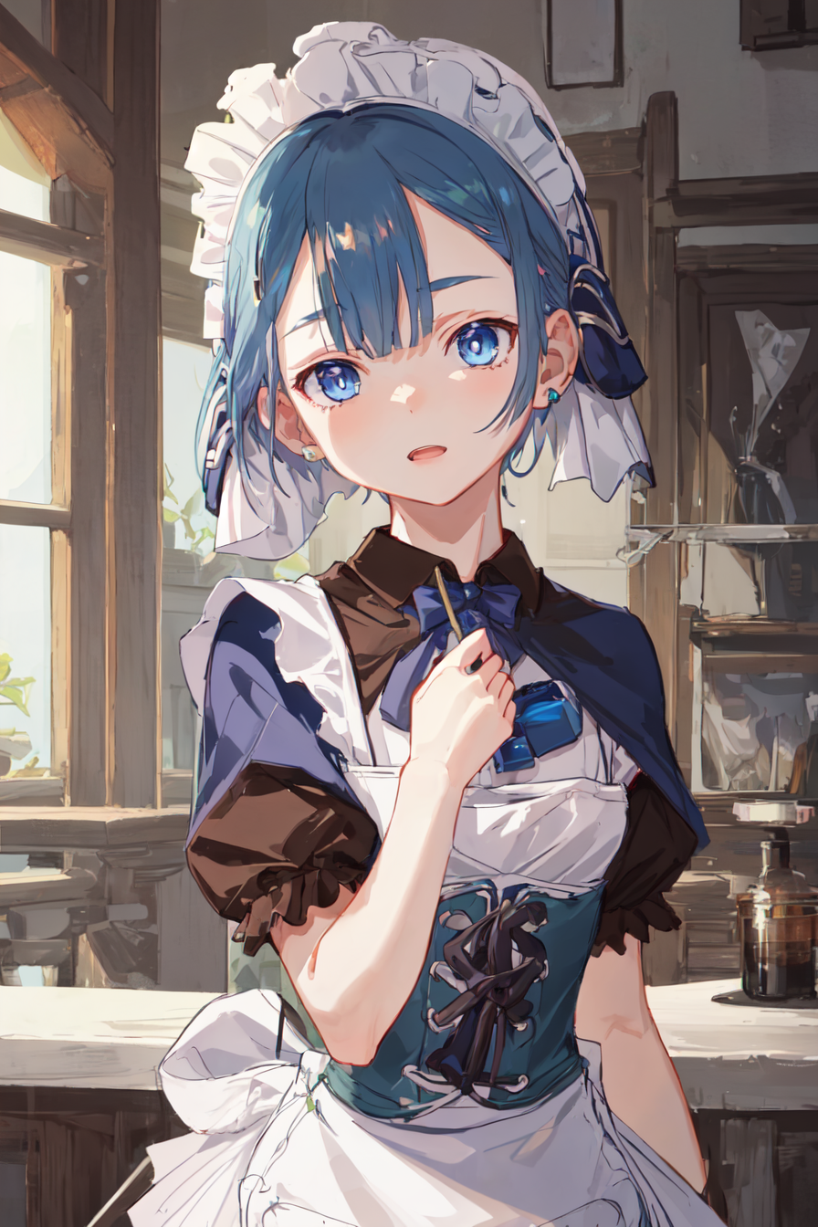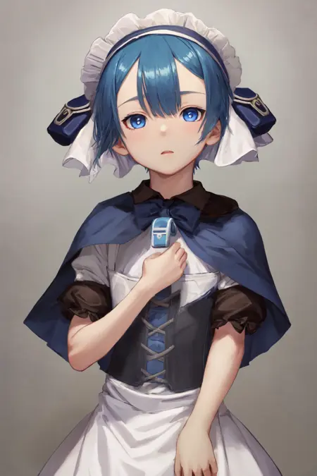 For better appearance add "blue eyes, otoko no ko, maid headdress, capelet, short sleeves, maid, apron, corset, (pouch hat covering ears:1.3)"