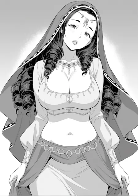 The lovely Queen that the MC of Game of Familia steals away from the elderly King. The monochrome manga depiction of her makes it hard to tell what color everything should be. But there was one small image on one of the color pages of the manga that showed she has dark skin, and green eyes. That said, leaving out any color in appearance/clothing and using monochrome will give her her appearance throughout the manga.