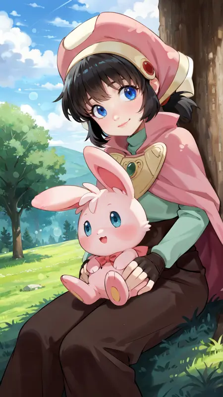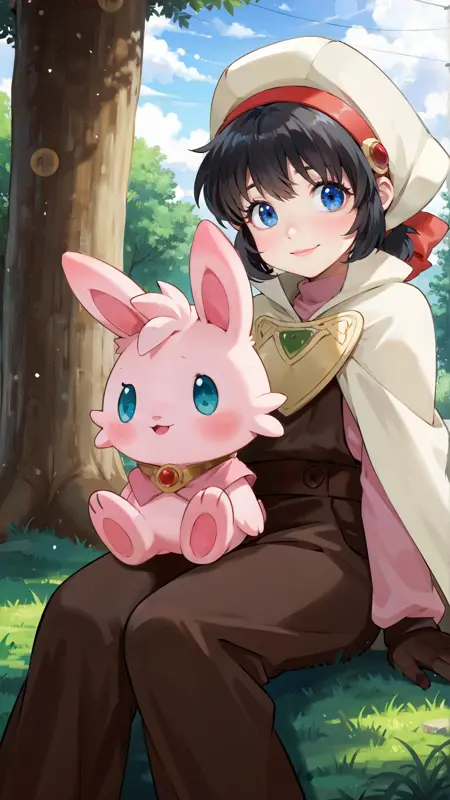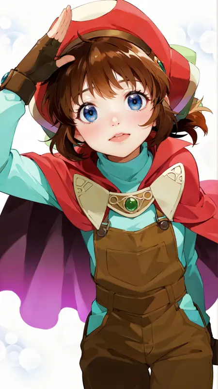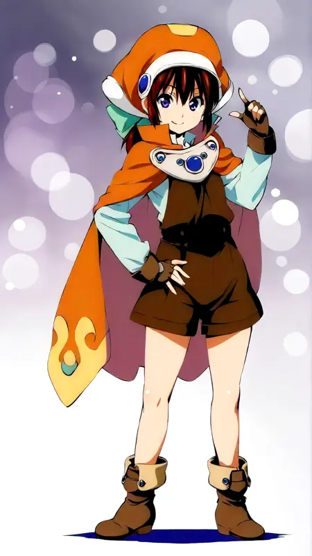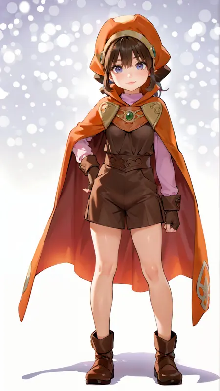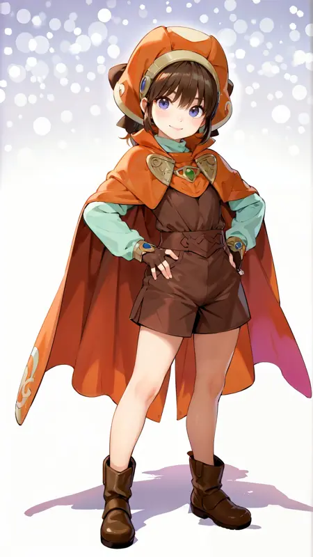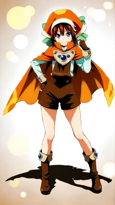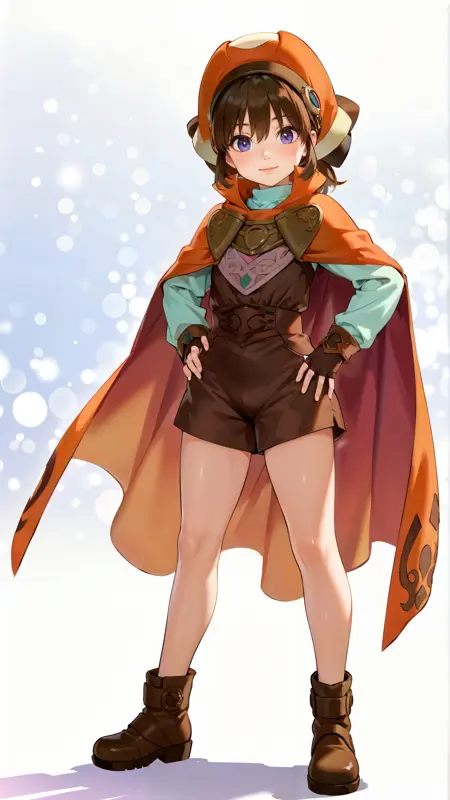 例のプロンプト: "marguerite_fatima, an anime girl, 1girl, solo, looking at viewer, smile, bangs, blue eyes, simple background, brown hair, shirt, gloves, long sleeves, hat, white background, hair between eyes, closed mouth, standing, purple eyes, full body, boots, shorts, fingerless gloves, cape, gradient, hand on hip, gradient background, shadow, brown footwear, brown gloves, brown shorts, orange headwear, short jumpsuit, orange cape"