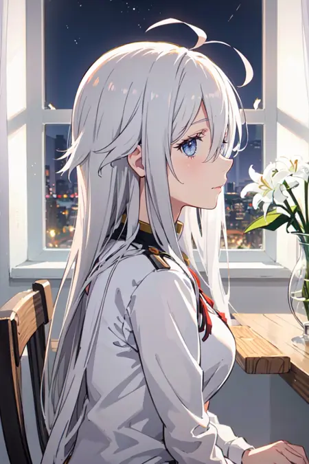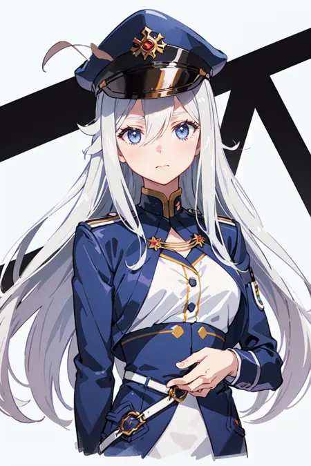彼女の_オリジナルの衣装_を使用する場合は、以下のタグを使用してください:pikkylena, 1girl, solo, looking at viewer, grey hair, white hair, long hair, hair between eyes, bangs, ahoge, blue eyes, grey eyes, breasts, medium breasts, uniform, thighhighs, military uniform, hat, garter straps, military hat, blue jacket, skirt, long sleeves, jacket, white thighhighs, white shirt, blue headwear, shirt, high-waist skirt, cropped jacket, zettai ryouiki, blue skirt
