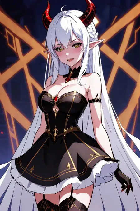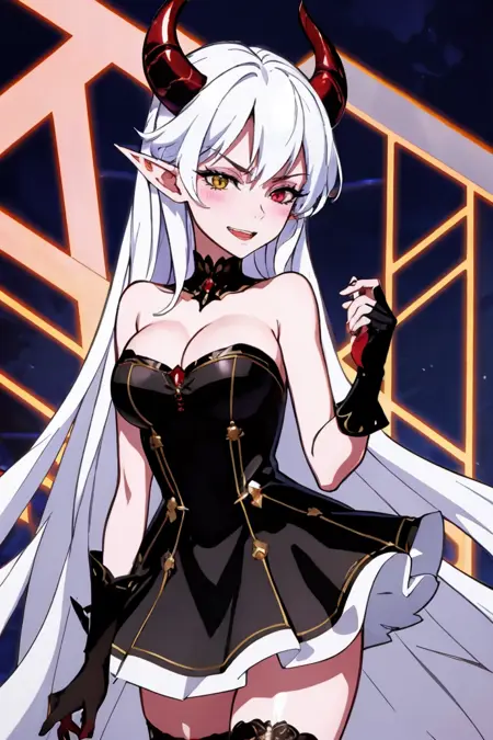 black dress, heterochromia, red eye, yellow eye, elf, red horns,