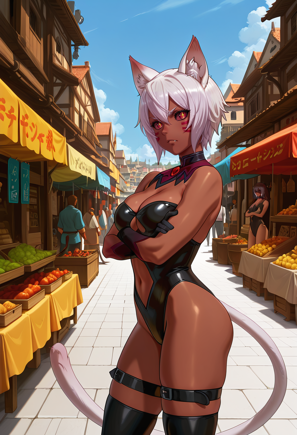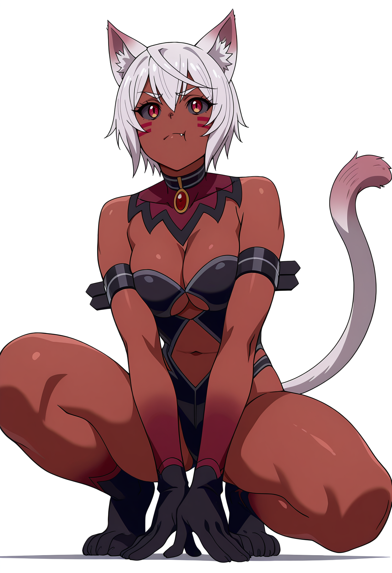 uliminas/cnn,facial mark, short hair, female, white hair, red eyes, cat ears, cleavage, medium breasts, cat tail, cat girl,