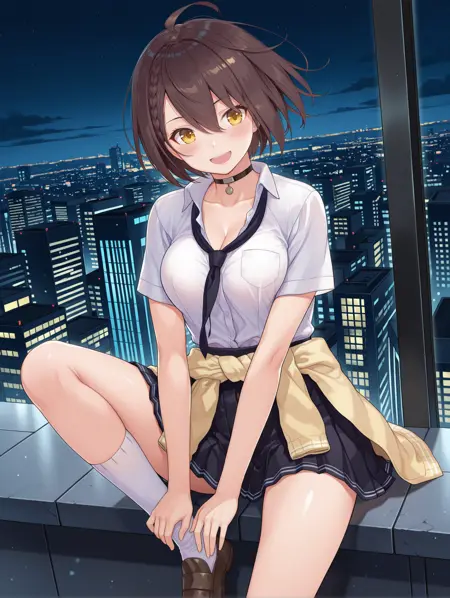 衣装(エースの放課後)・b_uniform,choker,loose necktie,black necktie,short sleeves,clothes around waist,pleated skirt,white socks,brown loafer,