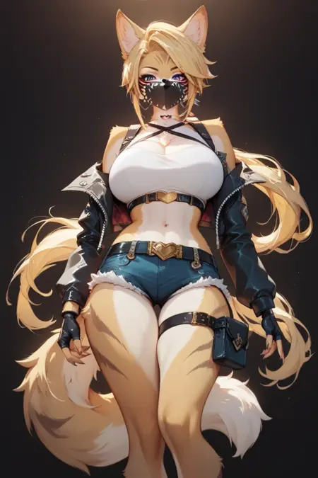1girl, Pulchra Fellini, furry, furry female, animal ears, tail, snout, large breasts, blonde hair, yellow fur, white body, fluffy tail, blue eyes, mask, mouth mask, gloves, fingerless gloves, jacket, belt, shorts, thigh strap