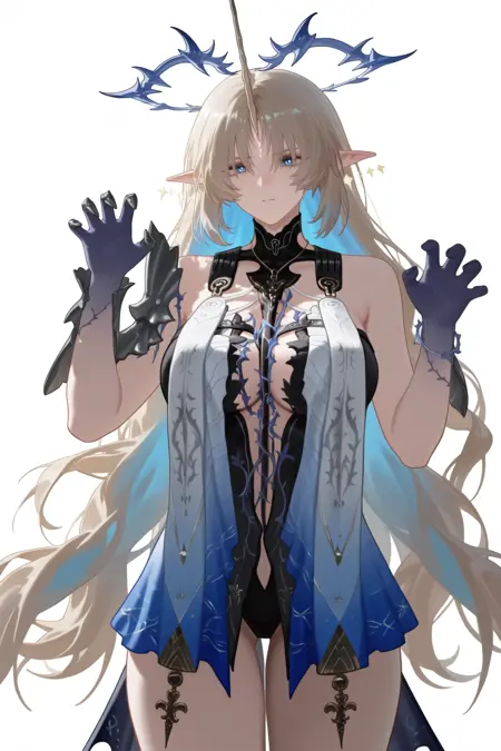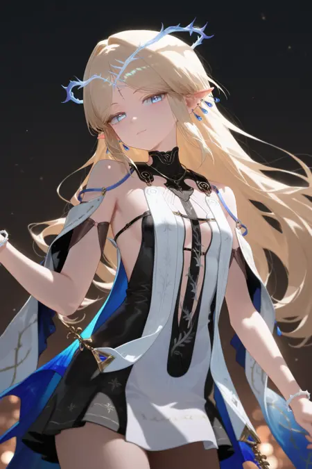fleurdelys \(Wuthering Waves\), 1girl, 青い目, 金髪, シングル, 黄色い一本の角, 尖った耳, 長髪, ハロー, 肩出し, ジュエリー, ドレス, イヤリング, 光る顔のマーク, とげの冠