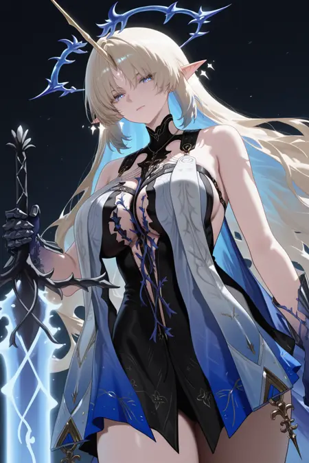 fleurdelys \(wuthering waves\), 1girl, blue eyes, blonde hair, solo, yellow single horn, pointy ears, long hair, halo, bare shoulders, jewelry, dress, earrings, glowing facial mark,crown of thorns,