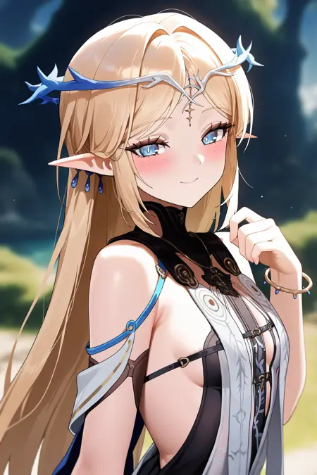 cartethyia \(wuthering waves\), 1girl, blue eyes, blonde hair, pointy ears, hair ornament, solo, long hair, jewelry, dress, elf, white dress, sandals, bare shoulders, blue earrings, earrings, black facial mark,crown of thorns