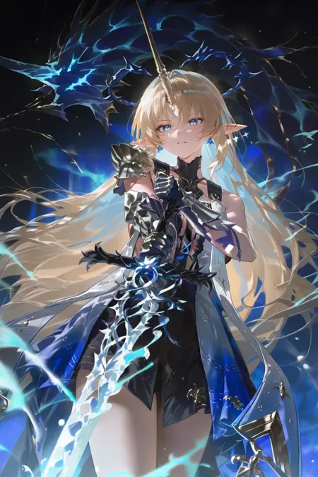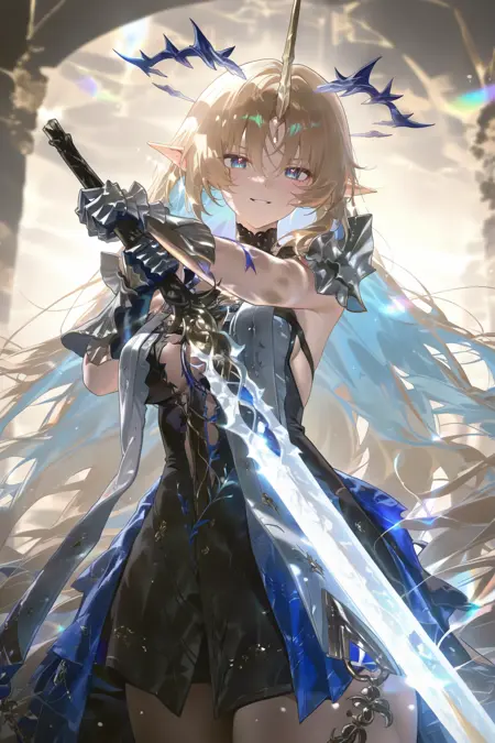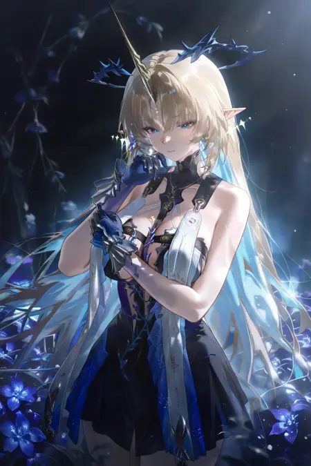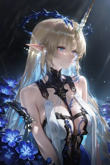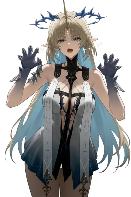 플뢰르델리스 (Wuthering Waves), 1girl, 파란 눈, 금발, 솔로, 노란 단일 뿔, 뾰족한 귀, 긴 머리, 환상, 어깨 노출, 보석, 드레스, 귀걸이, 빛나는 얼굴 무늬, 가시 왕관