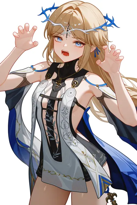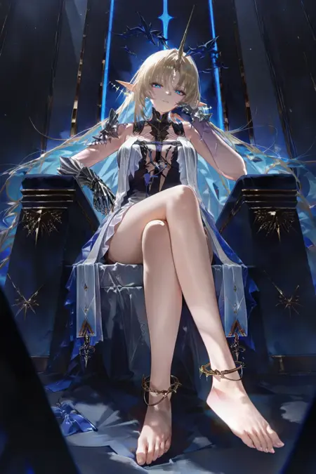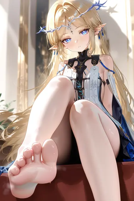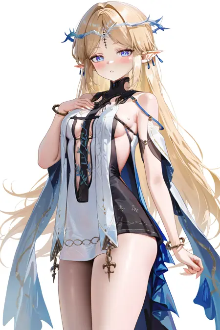 카르테시아 (Wuthering Waves), 1girl, 파란 눈, 금발, 뾰족한 귀, 머리 장식, 솔로, 긴 머리, 보석, 드레스, 엘프, 흰 드레스, 샌들, 어깨 노출, 파란 귀걸이, 귀걸이, 검은 얼굴 무늬, 가시 왕관