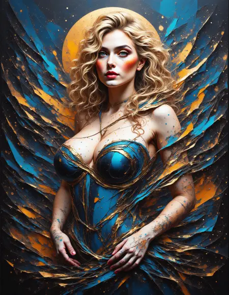 丰富的色彩与金色的起伏交织、精细的纹理与动态的构图,将你带入一个充满幻想与神话的超凡场景。在这迷人的画面中,还矗立着如石头般、金属质感的结构,以充满动感的优雅姿态升起,其表面既闪耀又粗糙,形成重量与光辉的鲜明对比。整体美学既坚实又空灵,激发了惊奇、流动的神秘感与宏伟气魄。