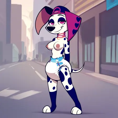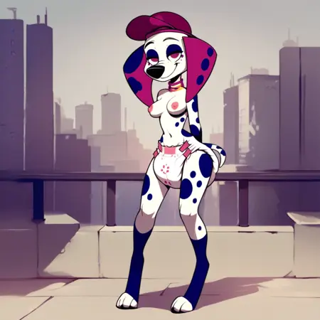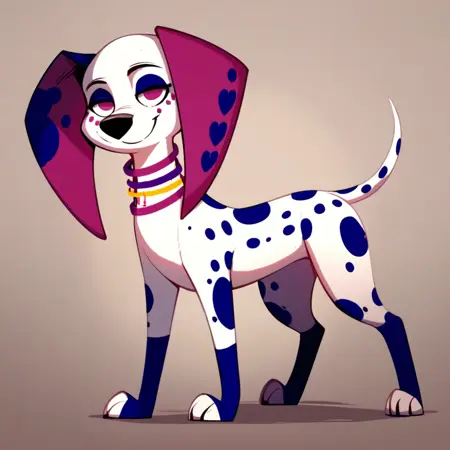 dalmatian, white and black hair, spotted fur, dog tail, pink eyes, black eyeshadow, black nose, three collars,