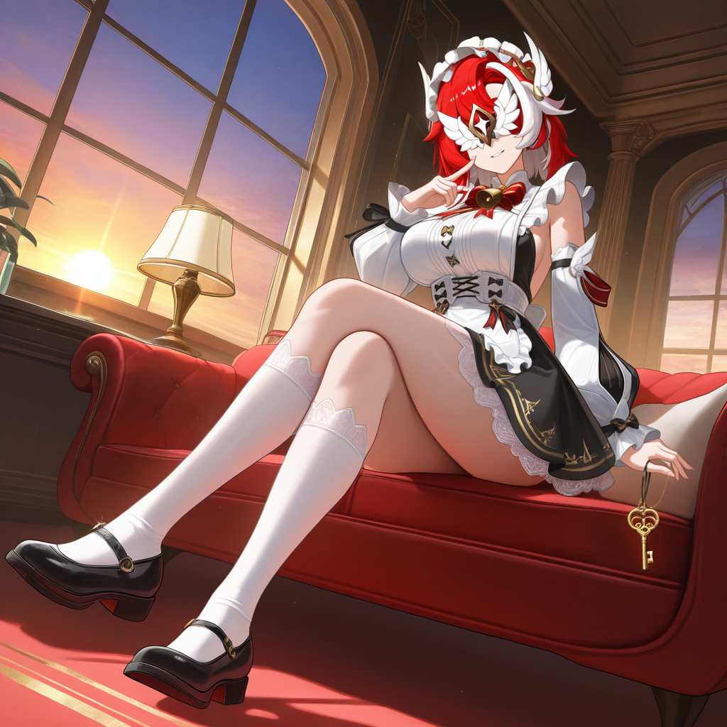 EikaStrv, Fol003, Ek_Lfb, 날개 프린트, 흰 눈 마스크, 눈 마스크, 흰 블라우스, 빨간 머리, 입, 흰색 스트라이프, 눈 가린 상태, 프릴 앞치마, 흰 앞치마, 엔마이디드, 십자가 끈 코르셋, 흰 코르셋, 검은 리본, 빨간 리본, 줄무늬 리본, 측면 컷아웃, 빨간 버크, 목 벨, 검은 리본, 프릴 드레스, 검은 드레스, 레이스 장식 치마, 열쇠, 벨, 프릴 칼라, 소매 없는 셔츠, 분리형 볼륨감 있는 소매, 흰 소매, 프릴 손목 커버, 메이드 헤어드레스, 날개 머리 장식, 흰 무릎까지 양말,