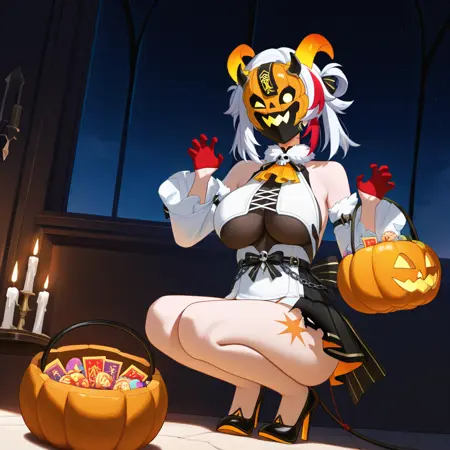 EikaStrv, Fol003, Ek_Hlw, 호박 마스크, 주황 마스크, 입 마스크, 검은 입 마스크, 해골 마스크, 검은 체인, 백발, 빨간 스트라이프, 머리 고리, 트윈테일, 이빨 프린트 마스크, 악마 뿔, 주황 악마 뿔, 할로윈 복장, 할로윈, 모피 칼라, 해골 장식, 노출된 다리, 손톱(장비), 검은 바디스톡킹, 소매 없는 바디스톡킹, 할터 드레스, 주황 아스콧, 프릴 아스콧, 노출된 어깨, 찢어진 옷, 주름 치마, 드레스 아래 치마, 흰 드레스, 짧은 드레스, 검은 치마, 흰 치마, 찢어진 치마, 허벅지 문신, 줄무늬 리본, 검은 리본, 분리형 소매, 언더부브, 긴 소매, 뒷 리본, 주황 프릴 소매, 흰 소매, 빨간 장갑, 반장갑,
