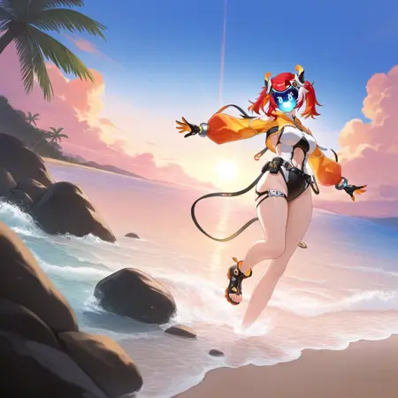 EikaStrv, Fol003, Ek_Swm, 빨간 머리, 주황 스트라이프, 짧은 트윈테일, 머리 장식, 반투명 마스크, 파랑 마스크, 기계식 뿔, 주황 슈러그, 슈러그(의류), 어깨 컷아웃, 주황 소매, 배꼽 컷아웃, 볼륨감 있는 소매, 원피스 수영복, 검은 수영복, 흰 수영복, 흰 상의, 금속 팔찌, 검은 장갑, 주황 손가락 커버, 느슨한 벨트, 검은 벨트, 허벅지 케이스, 중앙 컷아웃, 유틸리티 벨트,