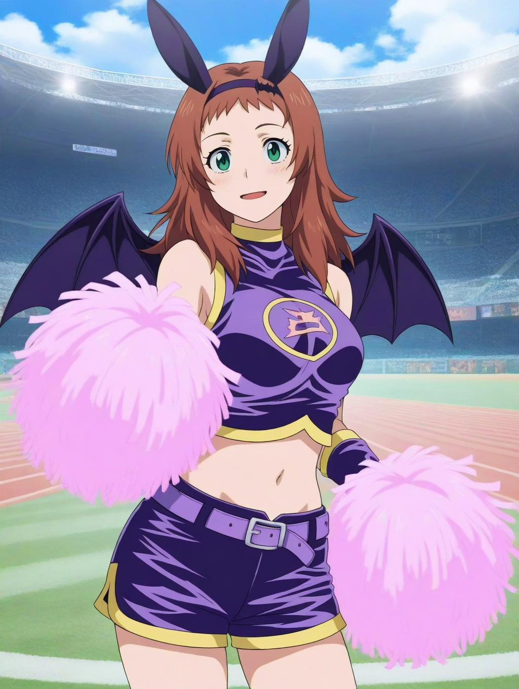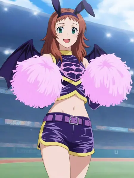 衣装2:動物の耳、うさぎの耳、紫のトップス、ノースリーブ、紫のベルト、エルボーグローブ、紫のショートパンツ、コウモリの翼、ポンポン(チアリーディング)