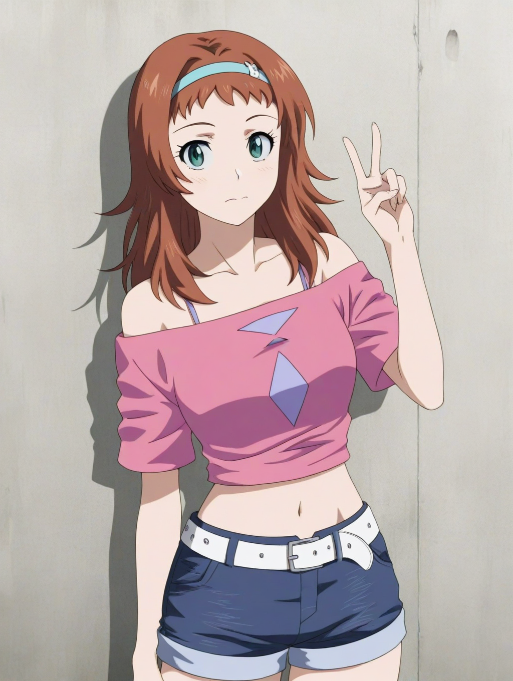 衣装1:ヘアバンド、肩出し、ピンクのオフショルダーシャツ、青いショートパンツ、白いベルト、お腹部分、