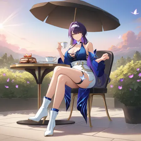 FlavStrv,Fol002,Flv_Cas,黄眼睛,长发,紫色头发,蝴蝶形瞳孔,吊带衫,蓝色衬衫,深蓝色内衣,交叉系带内衣,内衣若隐若现,露胸,铅笔裙,白色裙子,金色大腿带,金色链条,高腰带,白色腰带,可拆卸袖子,蓝色宽袖,袖口开衩,露肩,白色发带,蝴蝶项圈,