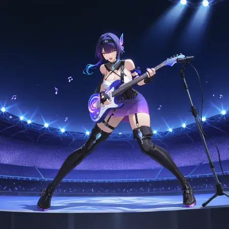FlavStrv,Fol003,Flv_Mus,黄眼睛,紫色指甲,指甲油,蝴蝶形瞳孔,蝴蝶发饰,短发配长发绺,单侧发绺,深紫色头发,渐变发色,条纹发,蓝色条纹,交叉吊带,黑色发带,耳机,臂饰,臂带,可拆卸衣领,透明露胸,尖刺领,白色胸衣,O型环上衣,渐变裙,紫色裙子,铅笔裙,黑色腰带,铆钉腰带,渐变带,多条腰带,另类黑色束腰,另类束腰,单只露指手套,黑色手套,交叉绑带,多条大腿带,黑色长筒靴,黑色腿饰,单只臂套,