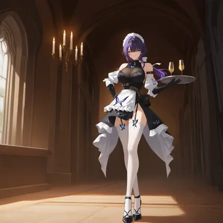 FlavStrv,Fol001,Flv_Maid,黄眼睛,长发,紫色头发,蝴蝶形瞳孔,低马尾,女仆装,短胯帘,无袖紧身衣,黑色紧身衣,透明露胸,黑色项圈,黑色束腰,束腰,荷叶边围裙,白色围裙,臂带,松垮腰带,黑色腰带,腰带袋,露肩,可拆卸蓬松袖子,白色袖子,蓬松短袖,交叉系带手套,黑色手套,肘部手套,发带,女仆头饰,荷叶边裙,开衩裙,黑色裙子,白色花边,吊袜带,蝴蝶印花,白色过膝袜,交叉绳带,