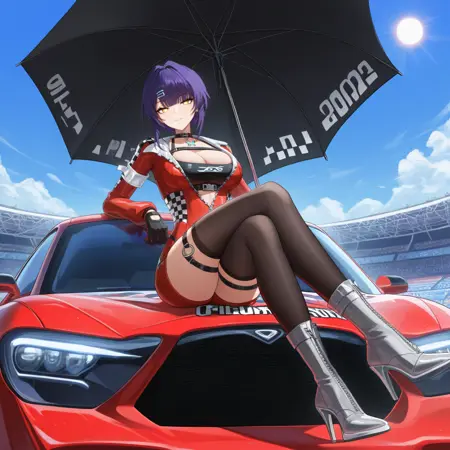 FlavStrv,Fol002,Flv_Bkr,黄眼睛,紫色头发,黄眼睛,蝴蝶形瞳孔,发夹,短发,红色骑行服,摩托车装,黑色过膝袜,O型环大腿带,格子图案,部分拉链敞开,黑色运动内衣,内衣若隐若现,露胸,胸带,黑色项圈,吊坠,白色臂章,红色袖子,双色手套,黑色手套,红色手套,拉链,