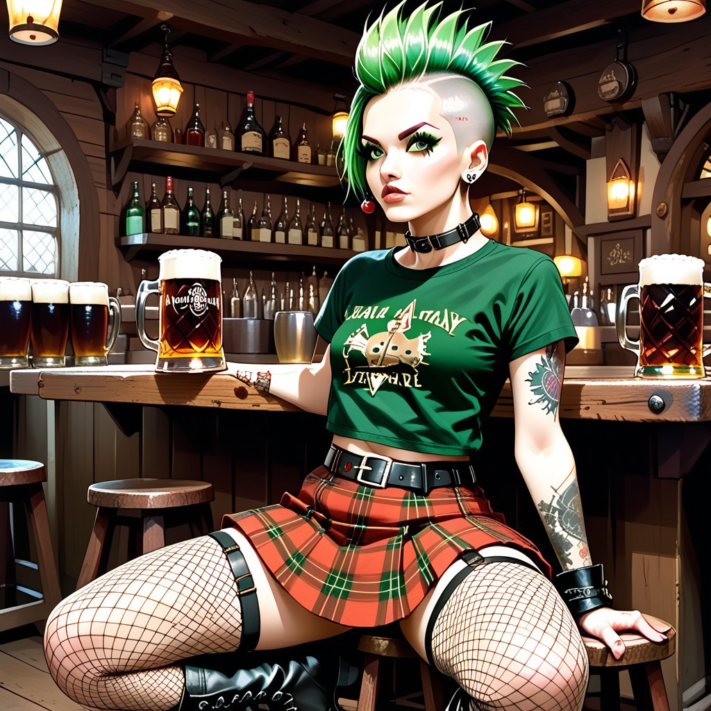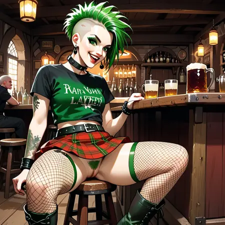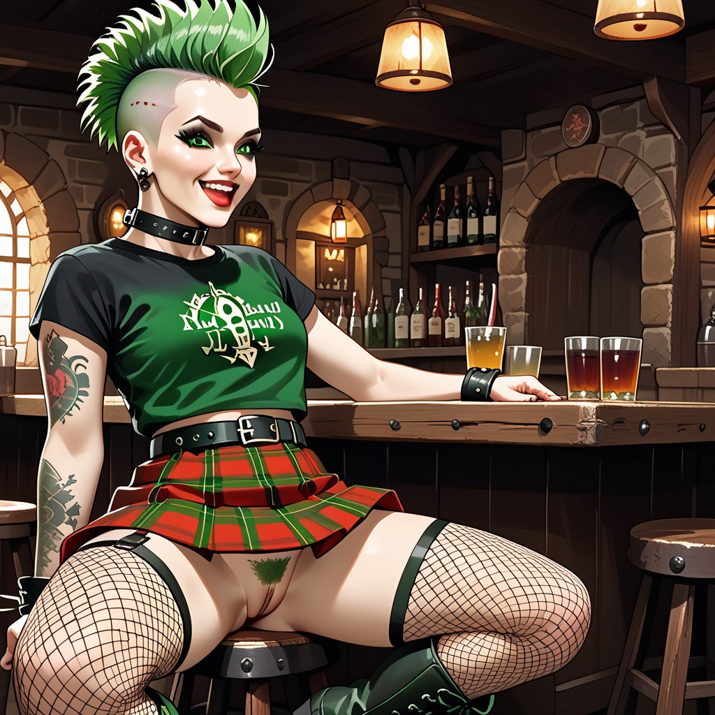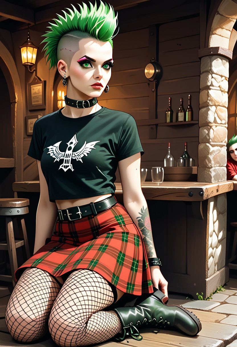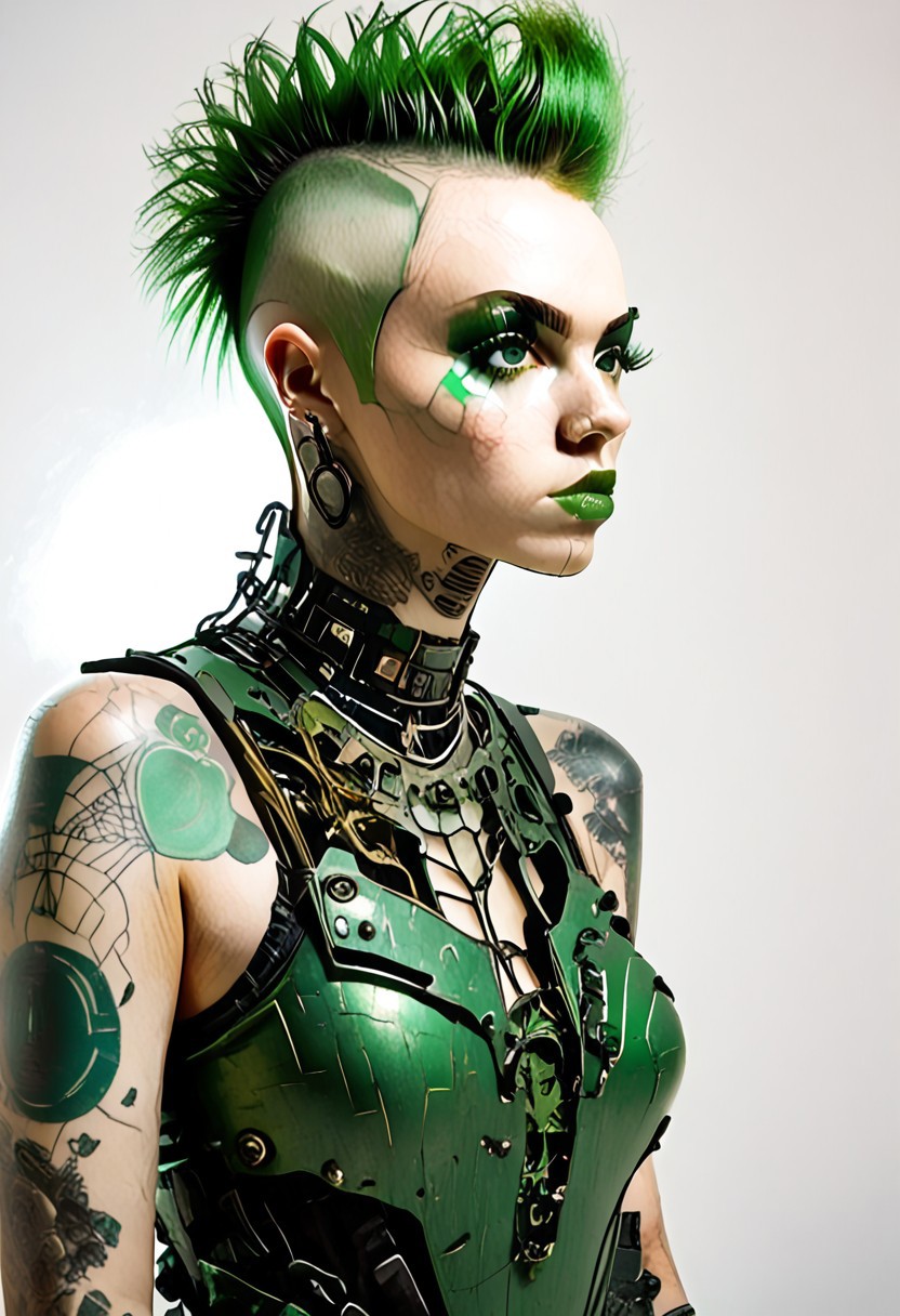 P0ll4, green hair, mohawk, short hair, undercut, makeup, green eyes, tattoo, breasts