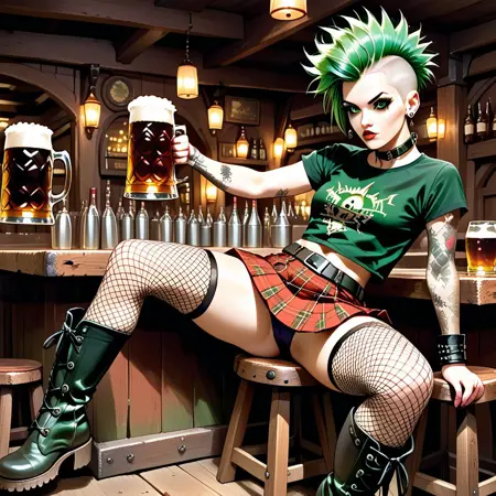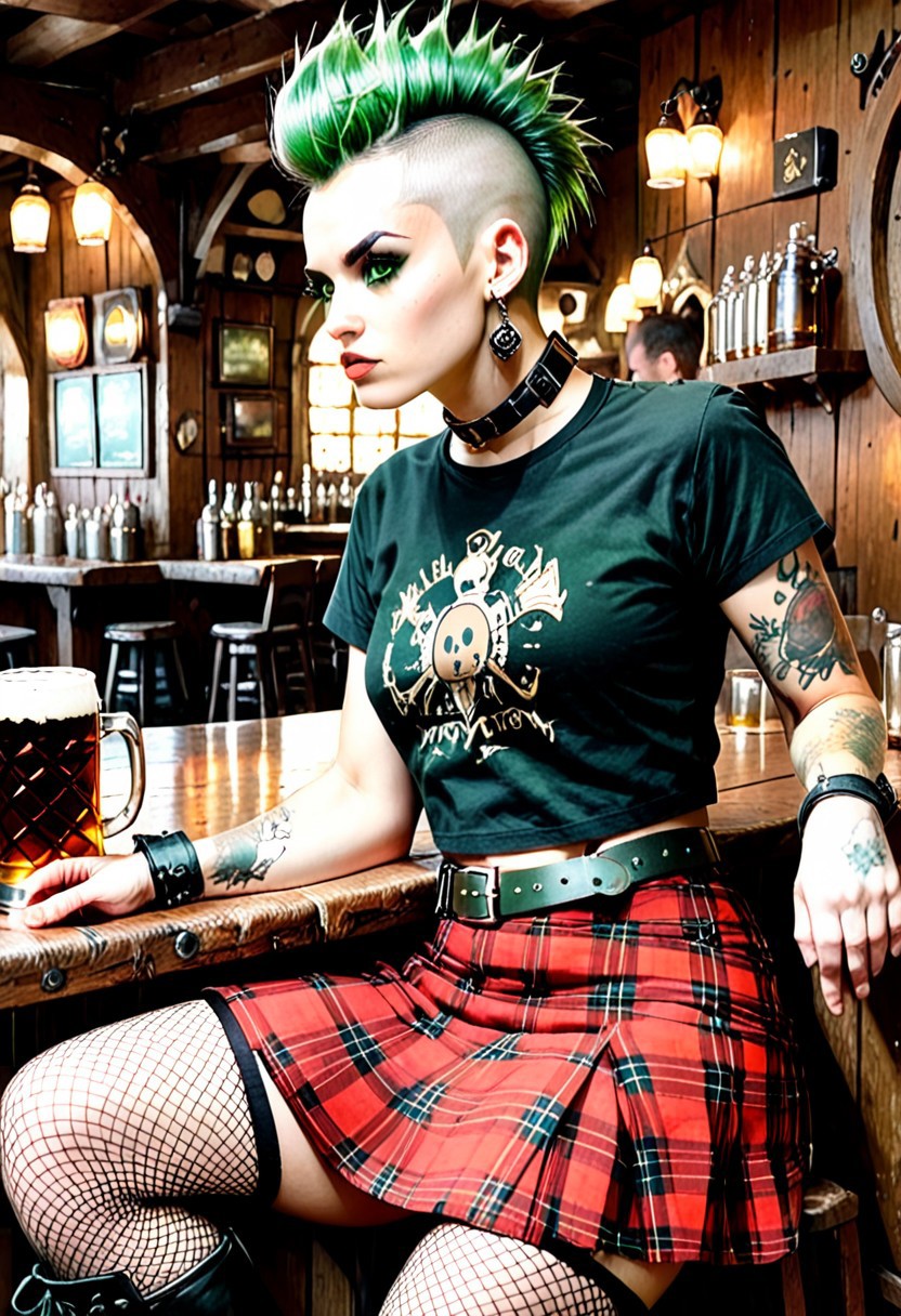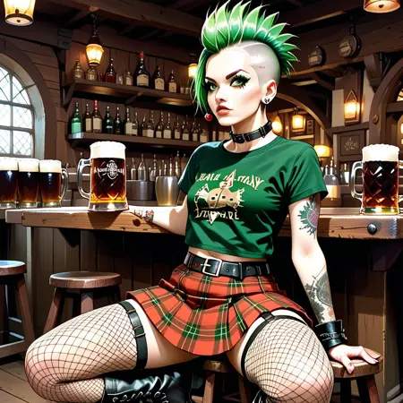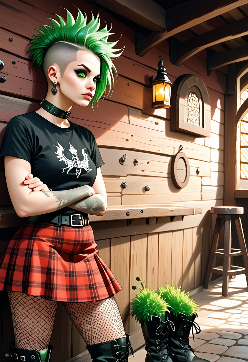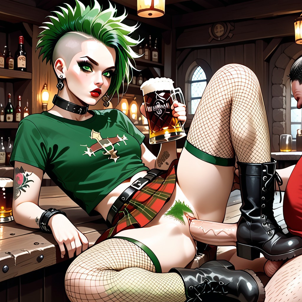 P0ll4, green hair, mohawk, short hair, undercut, makeup, green eyes, tattoo, breasts