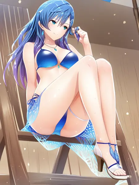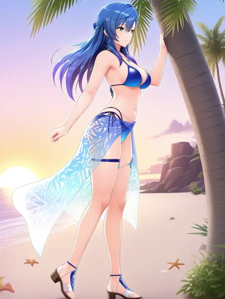 prompt example :natu,blue hair,long hair,hair ornament,blue gradient bikini,side-tie bikini bottom,see-through sarong,necklace,thigh strap,sandals,