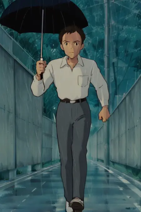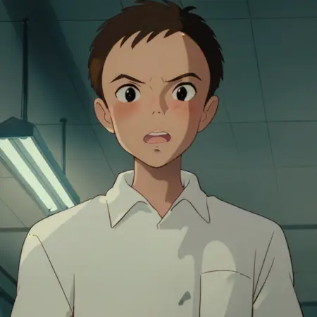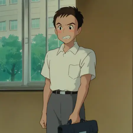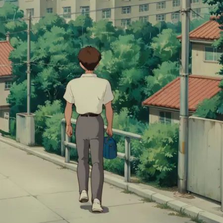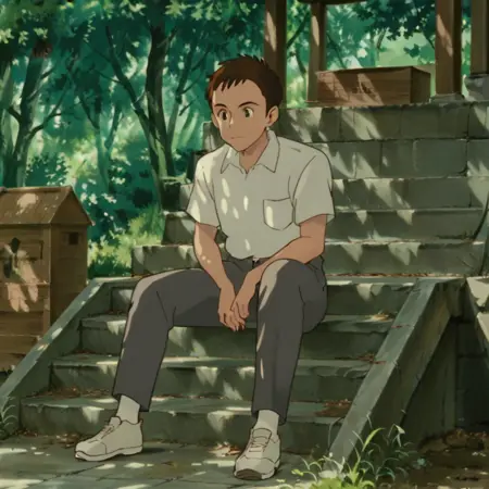 프롬프트: 남성, 갈색 머리카락, 검은 눈, 흰색 칼라 셔츠, 가슴 주머니, 단거리/장거리 소매, 벨트, 바지, 신발, 실내(교실/학교 책상/천정/천정 조명), 실내(학교/복도/창문), 야외(도시/집/건물/난간/관목/나무), 야외(교외/도로/집/전력선/울타리/나무), 야외(숲/나무/신사/잔디/계단/상자/햇빛/자국빛/그늘)