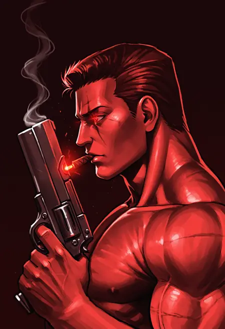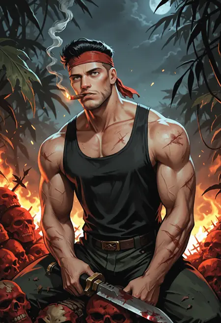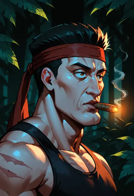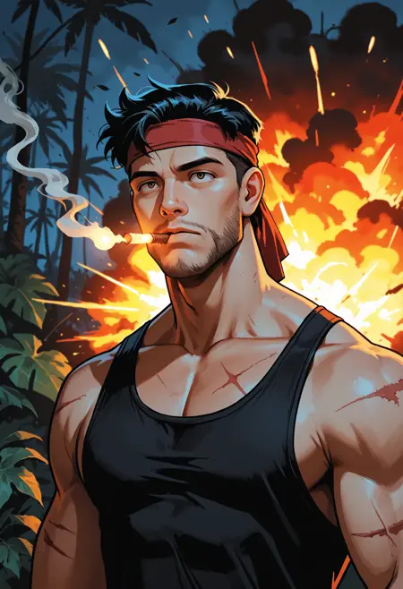 AAAAHHH "红头巾,点燃的雪茄,烟雾,背心,迷彩裤"