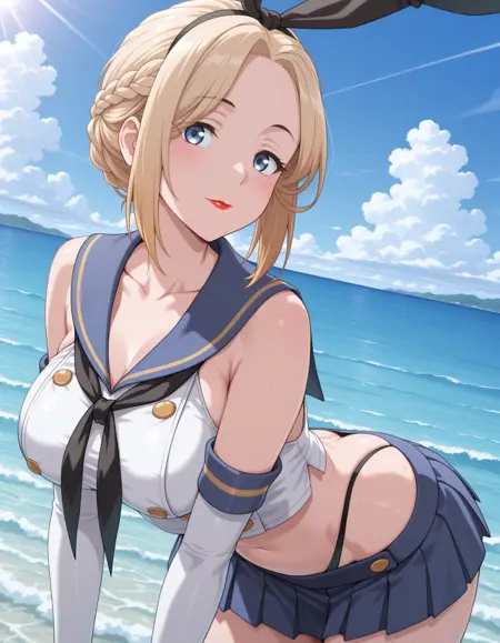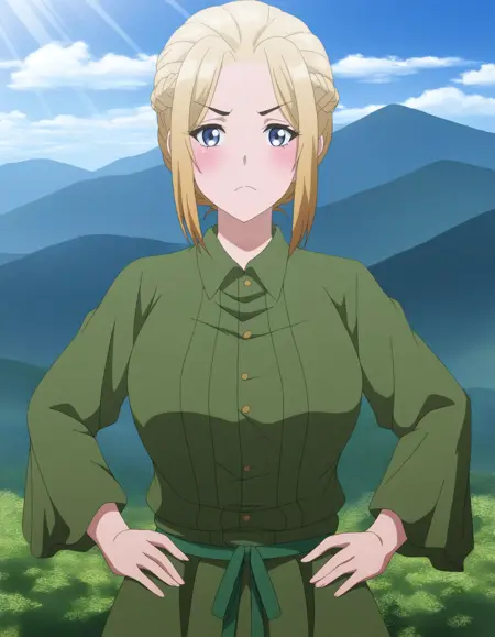 eptrm, 成熟した女性, 1girl, ブロンドの髪, ハーフアップの編み込み, 青い目 オプション: 赤い唇衣装1: