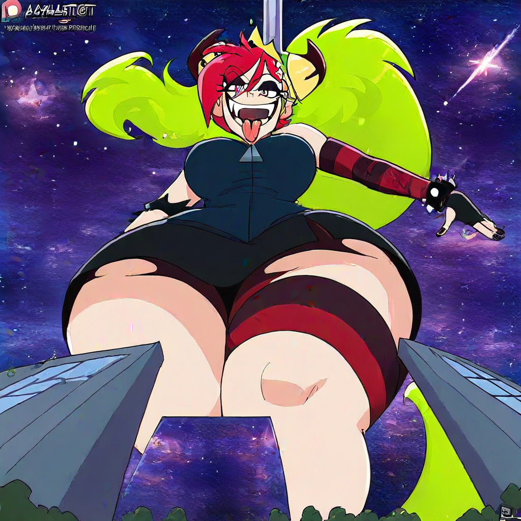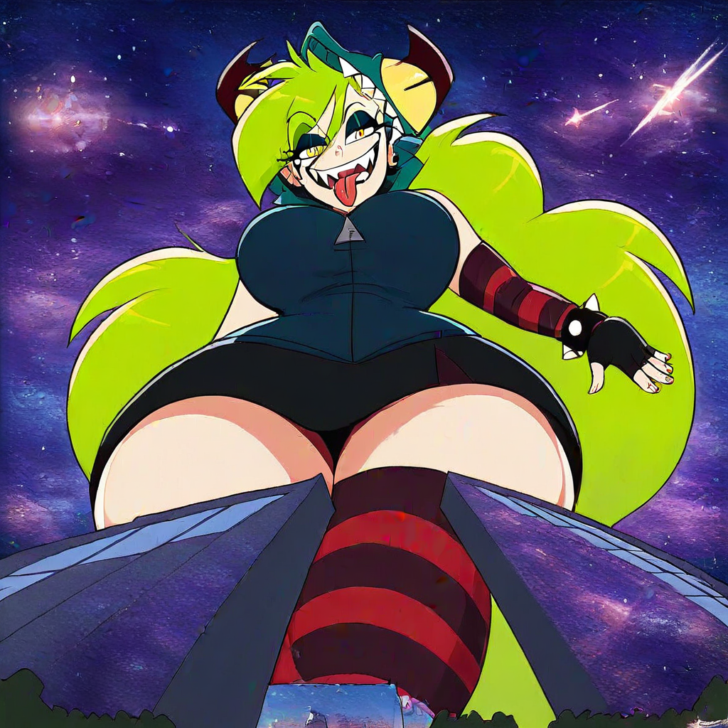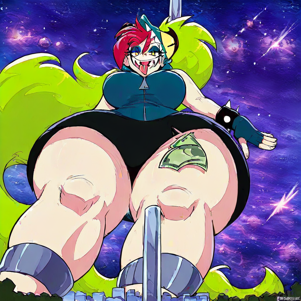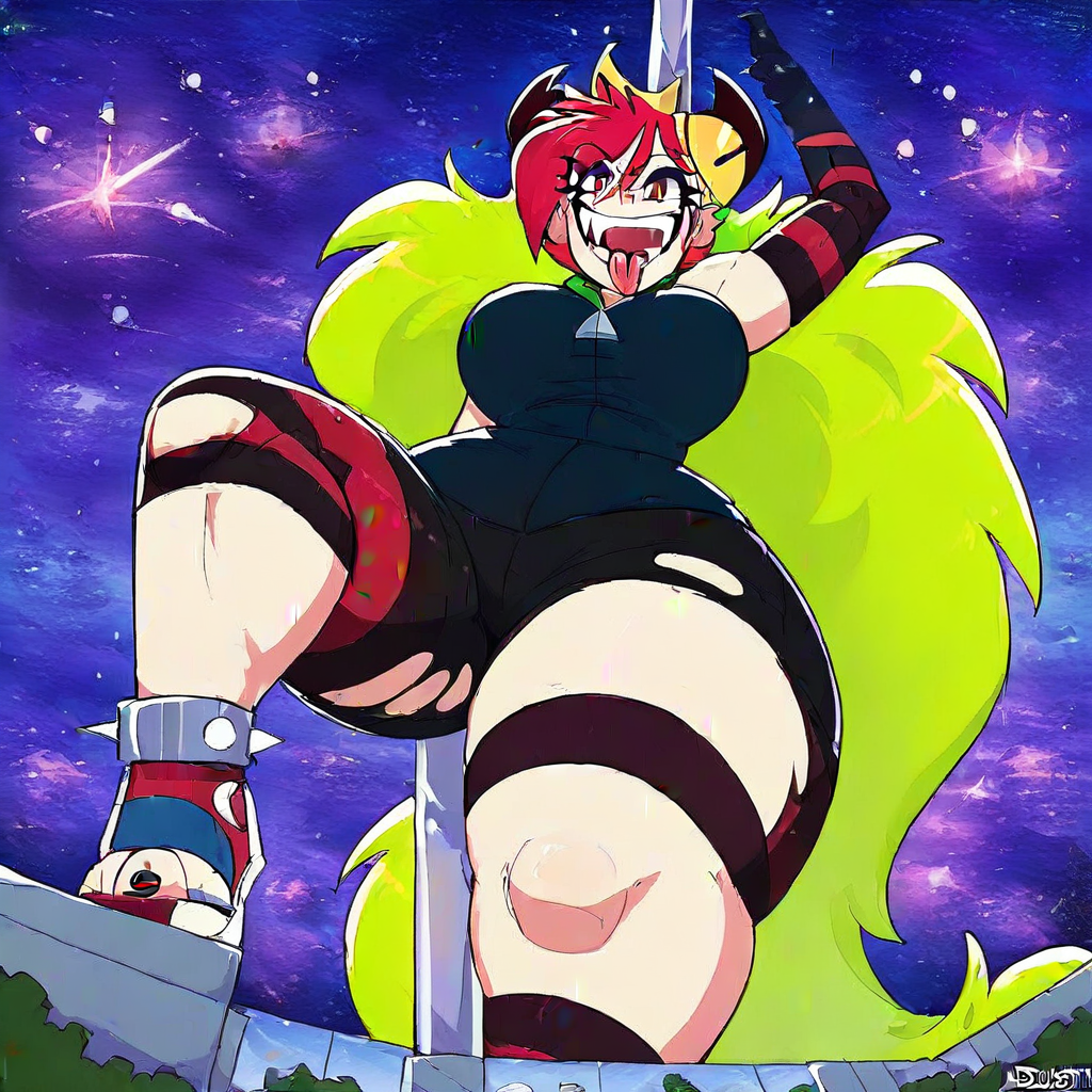 demencia, red hair, green ponytail, striped thighhighs, single striped sock, anklet, green monster hood, yellow eyes, sharp teeth, dark blue hoodie, single striped sleeve, red sneaker, blue sneaker, black skirt, smile, eyeshadow, spiked bracelet, zipper pull tab, torn pantyhose, glove, tongue out