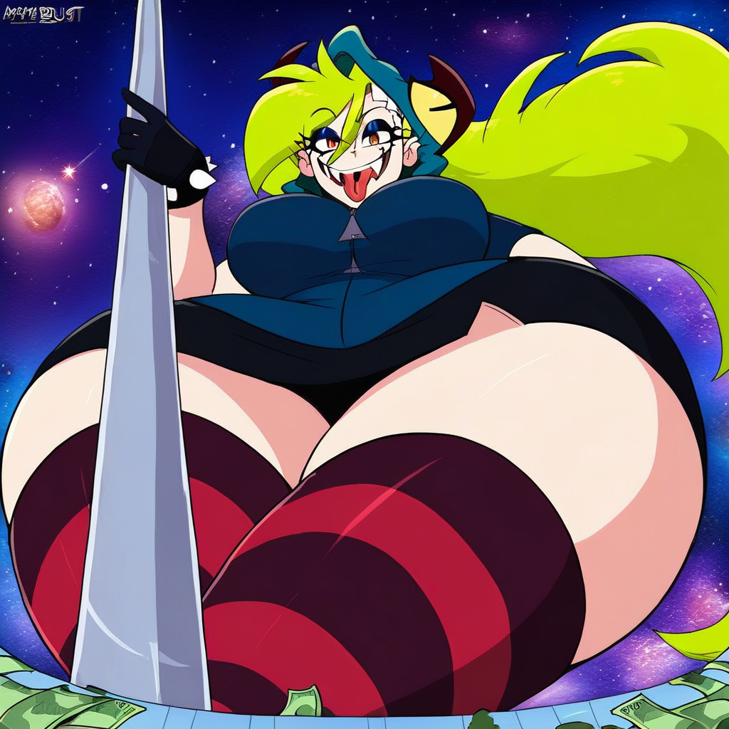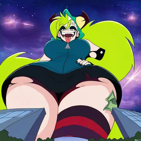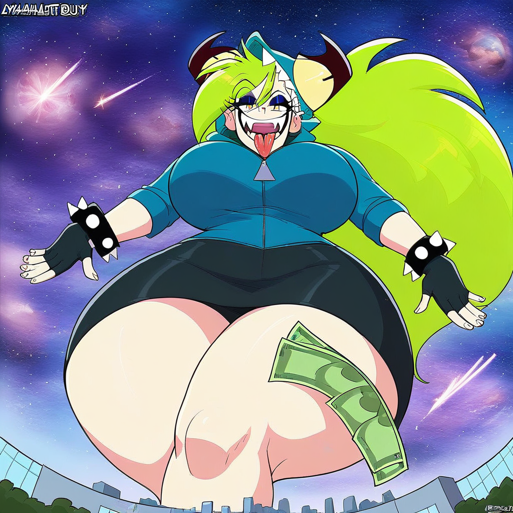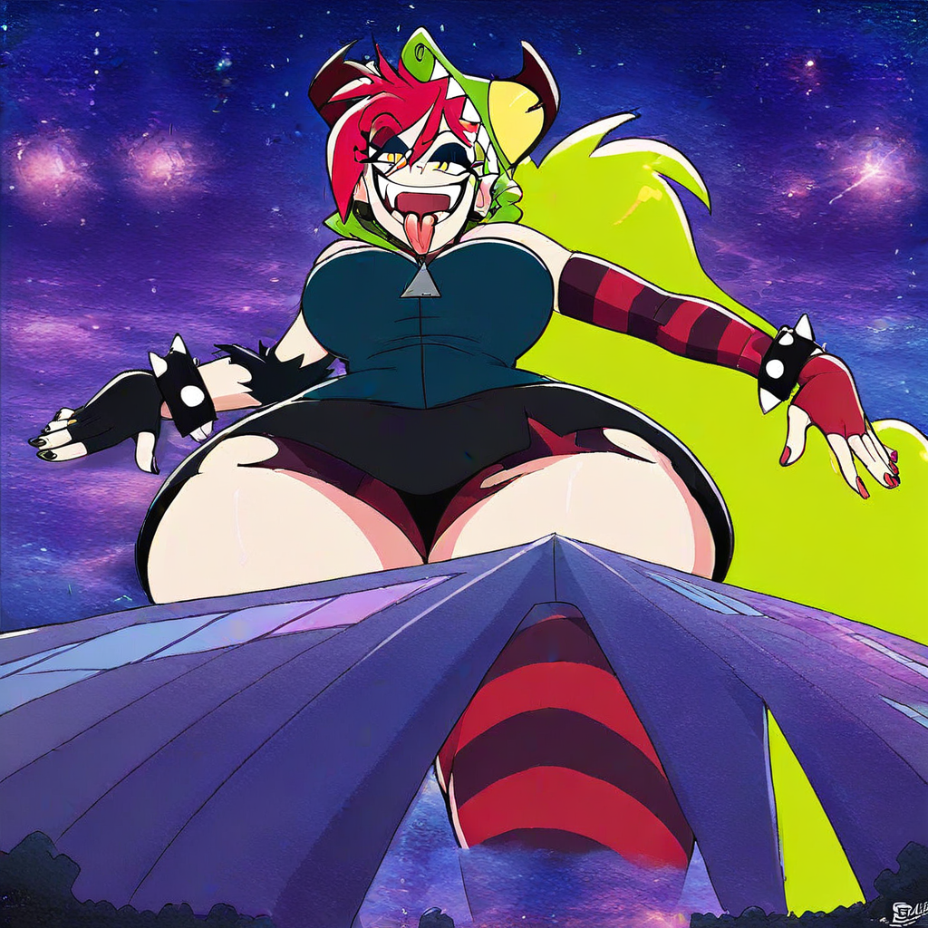 demencia, red hair, green ponytail, striped thighhighs, single striped sock, anklet, green monster hood, yellow eyes, sharp teeth, dark blue hoodie, single striped sleeve, red sneaker, blue sneaker, black skirt, smile, eyeshadow, spiked bracelet, zipper pull tab, torn pantyhose, glove, tongue out
