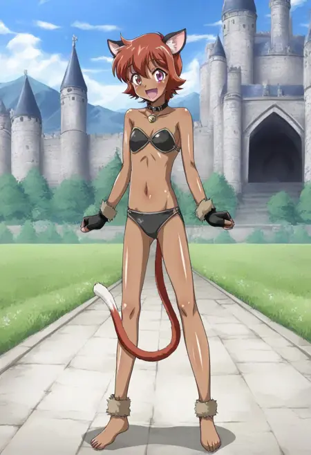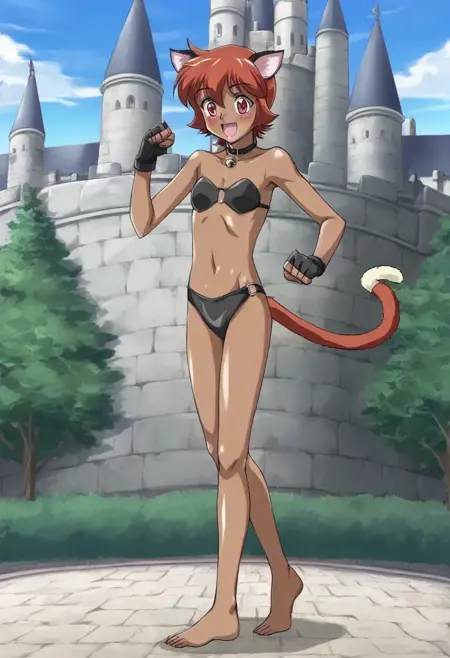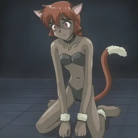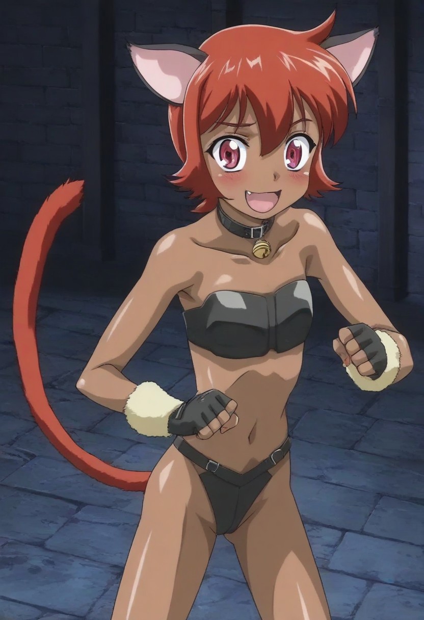 Miya_(Himekishi_lilia),项圈,猫耳,猫娘,黑色比基尼盔甲,深色皮肤女性,赤脚,红发,颈铃,毛皮皮肤,无指手套,短发,平胸,瘦弱