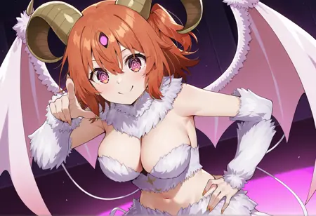 Notable tags: monster girl, orange hair, short hair, purple eyes, third eye, goat horns, tail, wings, revealing clothes, fur trim, bodysuit under clothes, sharp fingernails