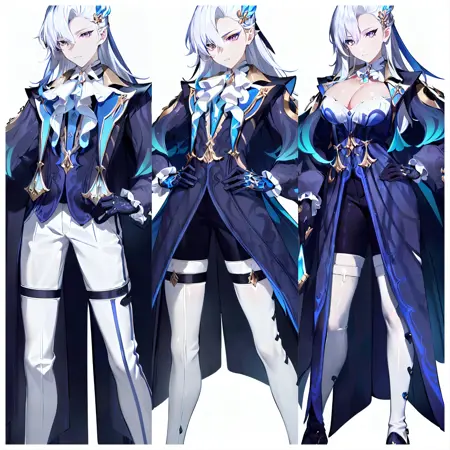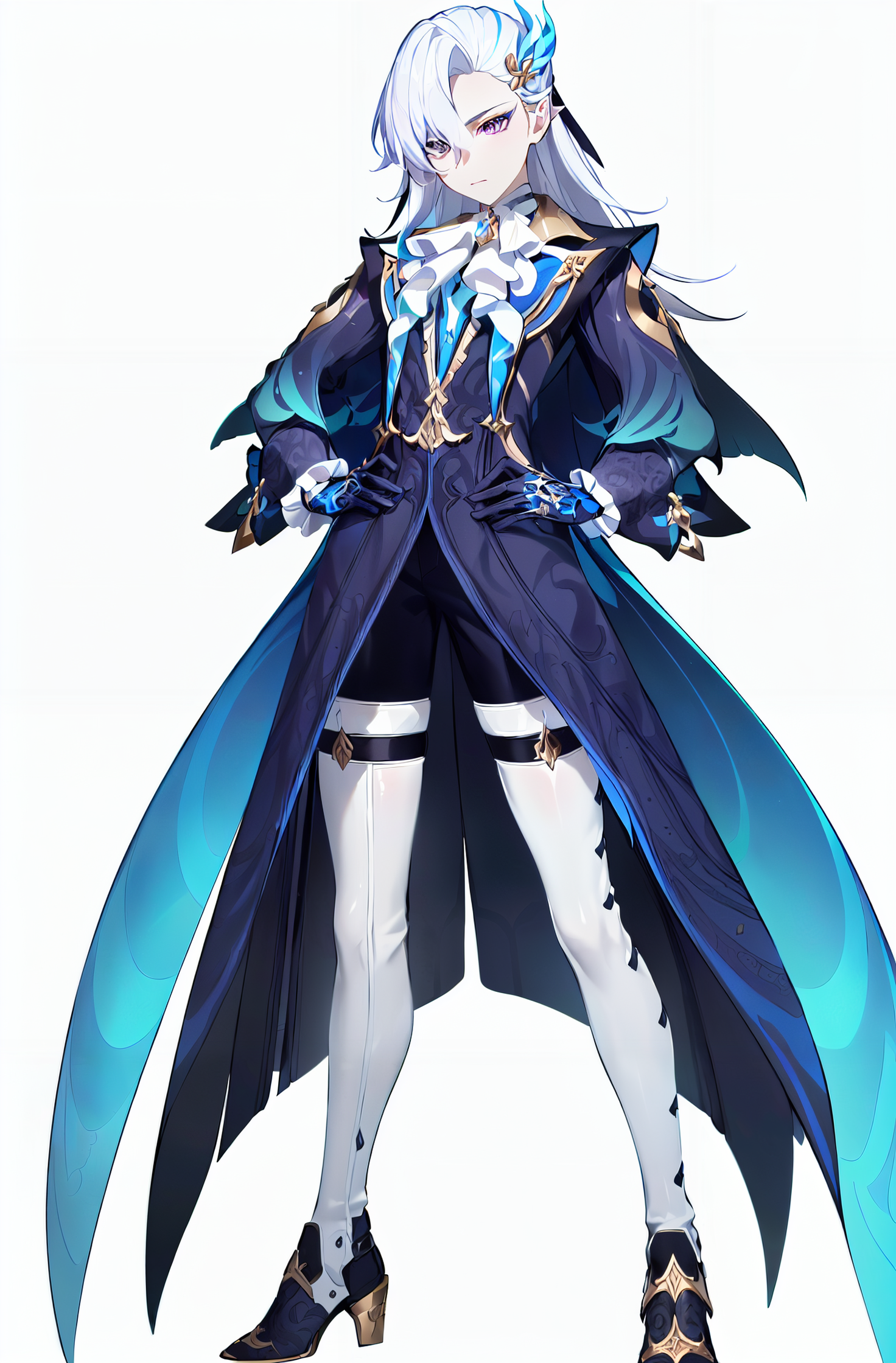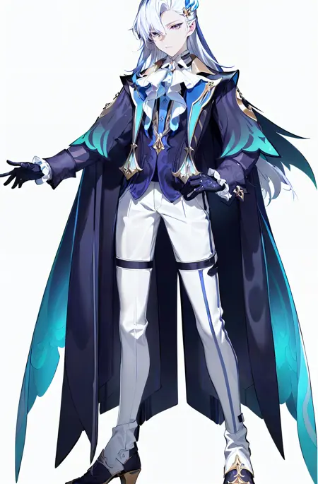 男(male):navit,1boy,gloves,male focus,black gloves,purple eyes,black footwear,white hair,long hair,white ascot,(man,strong,tall male,:1.2)