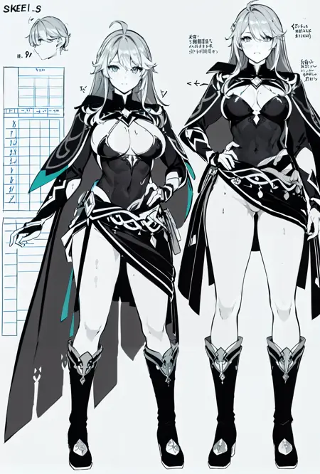1girl, aierhaisen, female focus, grey hair, bangs, black footwear, green cape, boots, partially fingerless gloves, ahoge, large breasts, long hair, open clothes,cleavage,