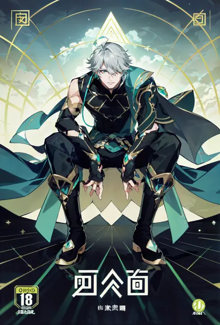 1boy, aierhaisen, male focus, grey hair, bangs, black footwear, green cape, boots, pants, partially fingerless gloves, ahoge, shirt, man,strong