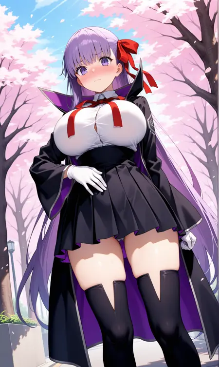 bb (fate), 보라색 눈, 보라색 머리카락, 곧은 앞머리, 매우 긴 머리카락, 헤어 리본, 빨간 리본