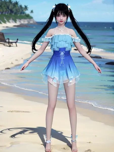 正面:loli, solo, lora:[衣服]-[泳装-天刀少女]tdsvyz_v2[LyCORIS]:0.65, tdsvyz, early teen, petite, hair_ornament, brown hair, twintails, flat chest, blue dress, tether bracelet, ankle trim, barefoot, no_shoes,