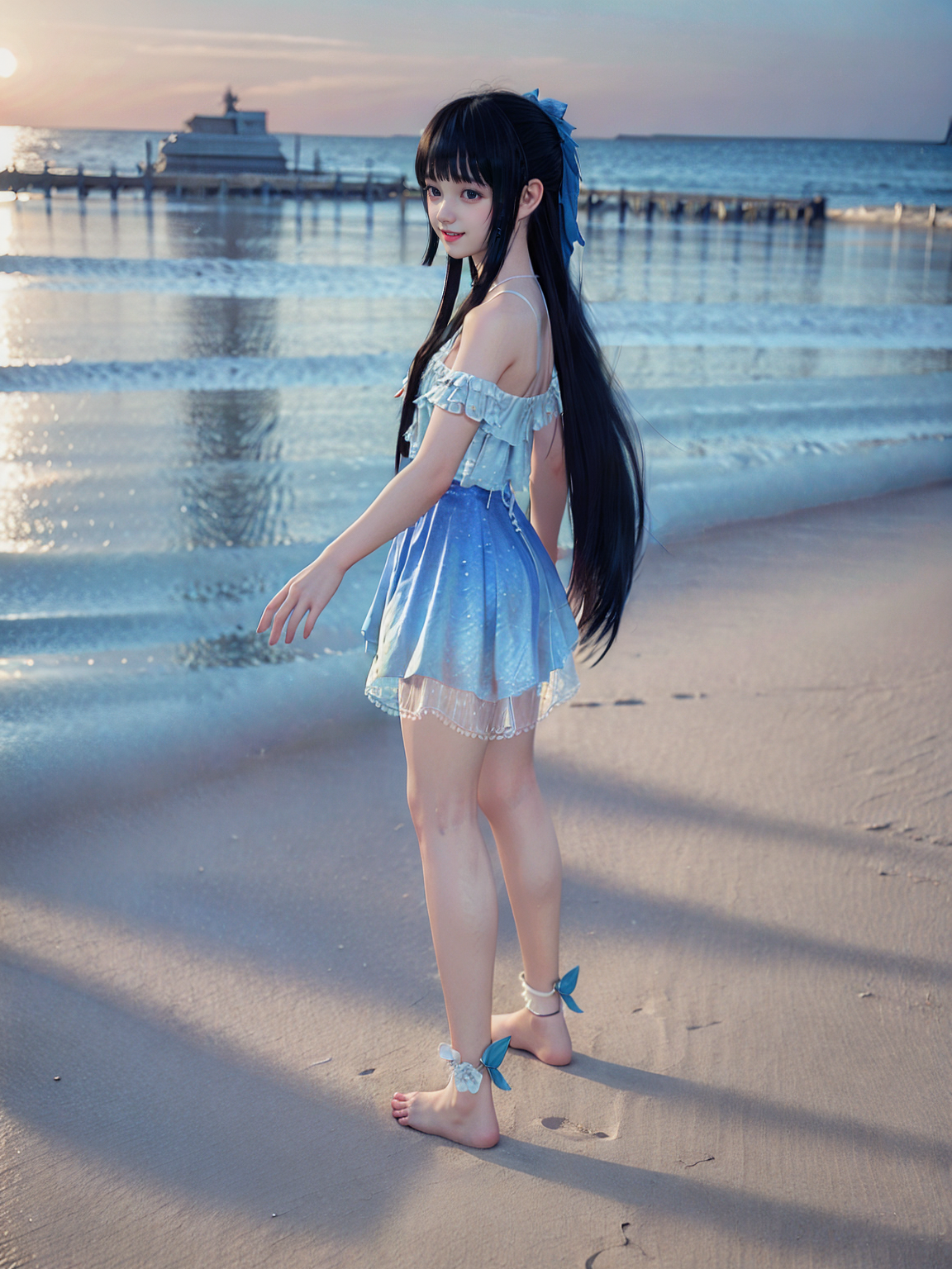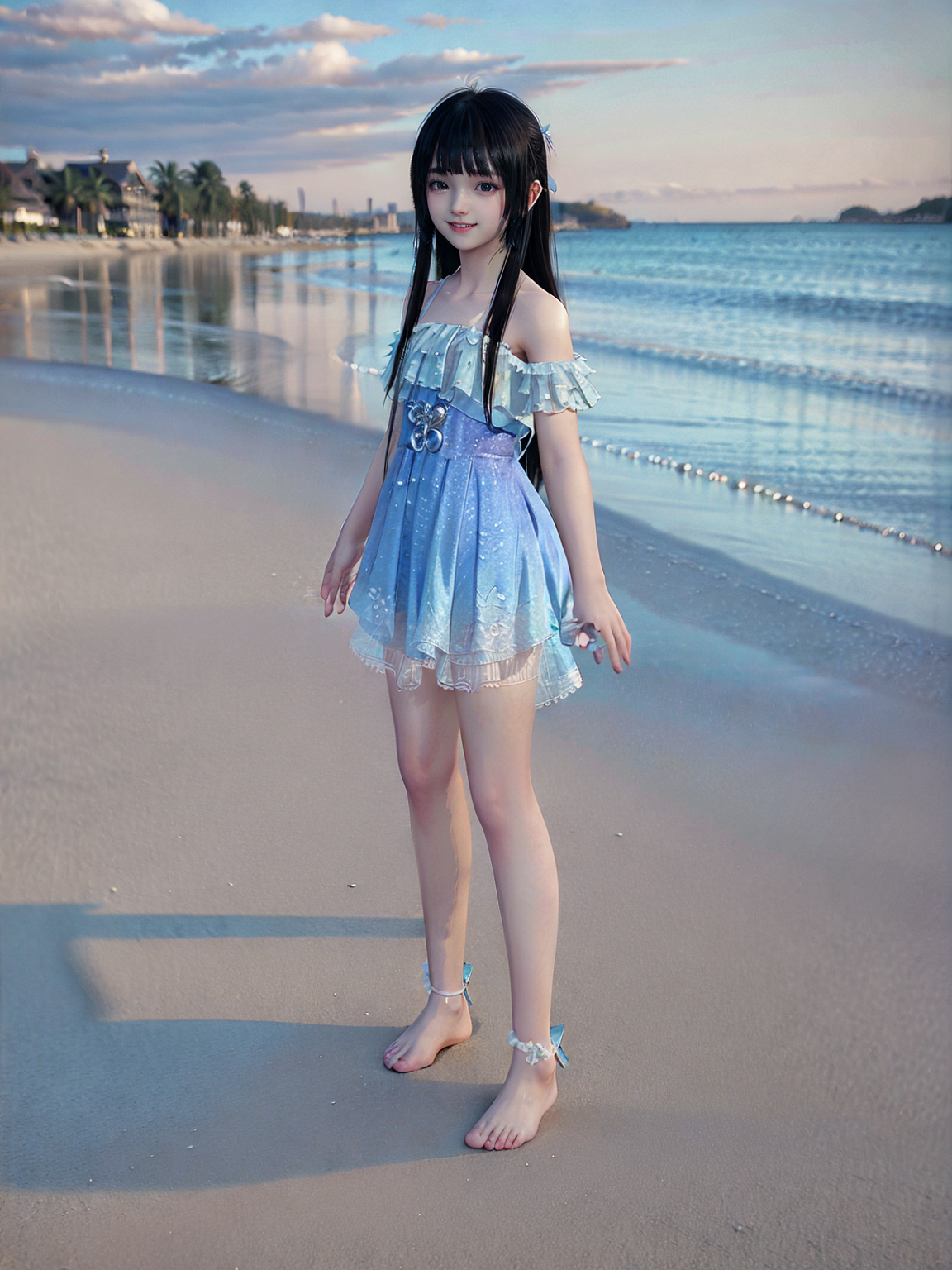 정면: loli, solo, lora:\[옷\]-\[수영복-천도소녀\]tdsvyz\_v2\[LyCORIS\]:0.65, tdsvyz, early teen, petite, hair_ornament, 갈색 머리, 더블테일, 평평한 가슴, 파란색 드레스, 테더 팔찌, 발목 장식, 벌거벗은 발, 신발 없음,