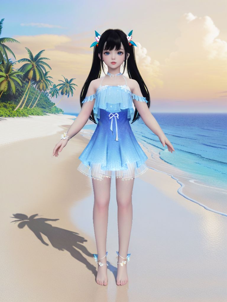 正面:loli,solo,lora:\[衣服\]-\[泳装-天刀少女\]tdsvyz\_v2\[LyCORIS\]:0.65,tdsvyz,early teen,petite,hair_ornament,brown hair,twintails,flat chest,blue dress,tether bracelet,ankle trim,barefoot,no_shoes,