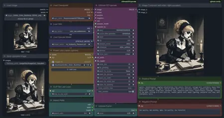 このワークフローを使えば、SDXLおよび同様のモデルで、簡単に任意の画像をアップスケールできます。アップスケールしたい画像を選択し、設定(ピンクと青で示された部分)を調整して、プロンプトを入力するだけで完了です。