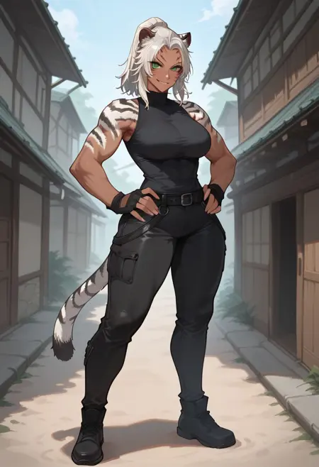 white hair, ponytail, tall female, toned, tiger fur, tiger tail, tail, green eyes, facial marks, tiger ears, large breasts, dark-skinned female,