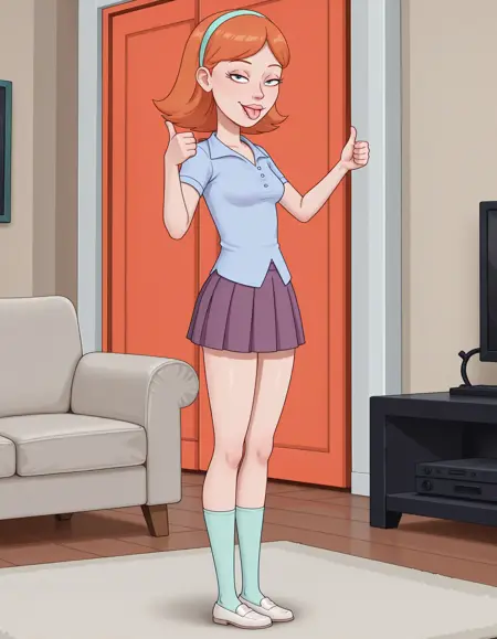 rnmjessica, 1girl, solo, 오렌지 헤어, 미디엄 헤어, 속눈썹, 립스틱, 시안 헤어밴드, 퍼린클 풀오버, 모브 미니스커트, 주름스커트, 시안 양말, 흰색 로퍼