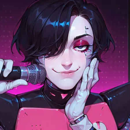 : 검은 머리카락, 눈을 가린 머리카락, 안드로이드, 로봇, 흰 피부, 어깨 장갑, 분홍색 가슴판, 흰 장갑, 가죽 바지, 분홍색 부츠