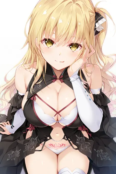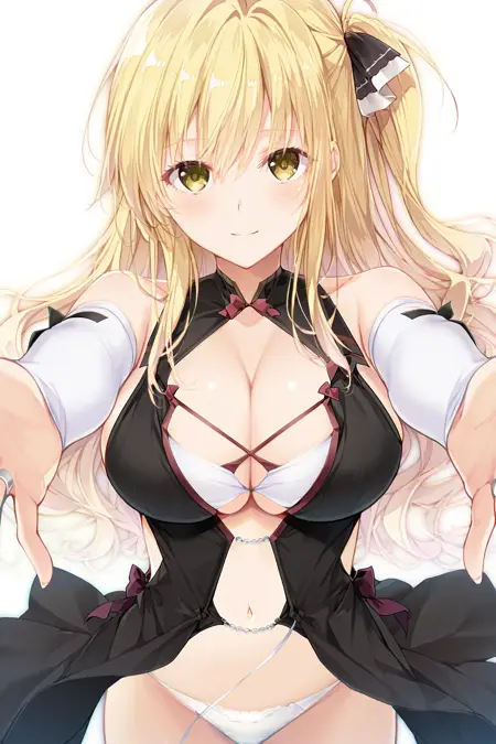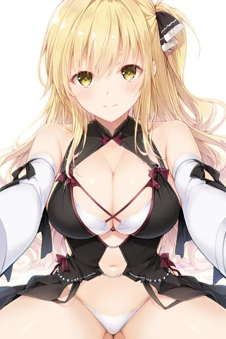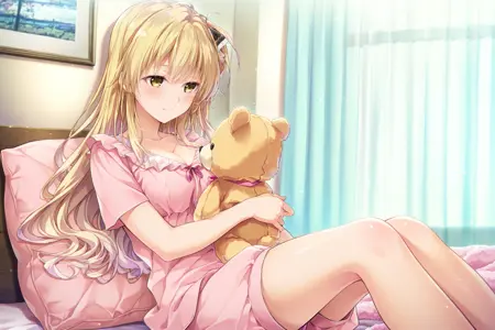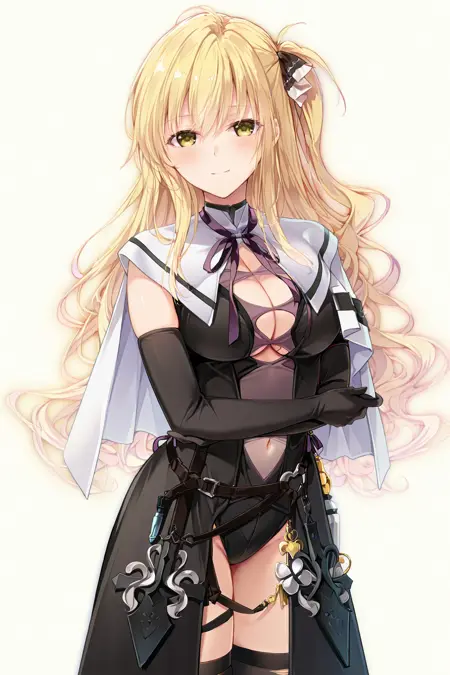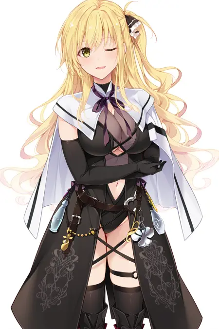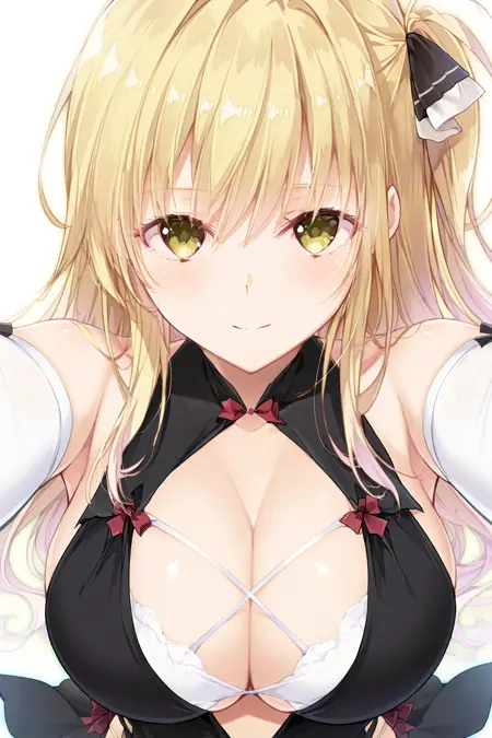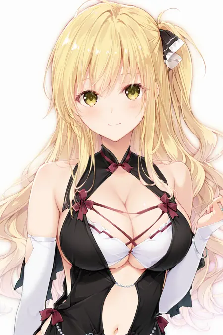 ShindouYuuka, blonde hair, long hair, wavy hair, one_side_up, sidelocks, amber_eyes, hair_ribbon